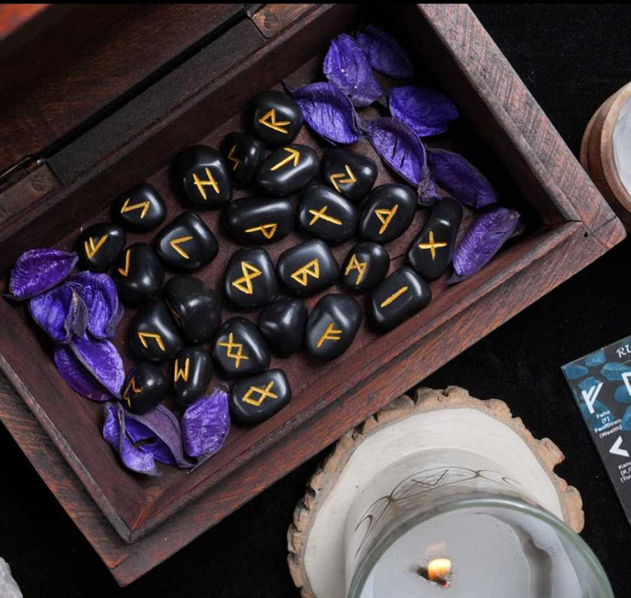 - Includes a set of 25 Black Tourmaline rune stones engraved with Elder Futhark symbols